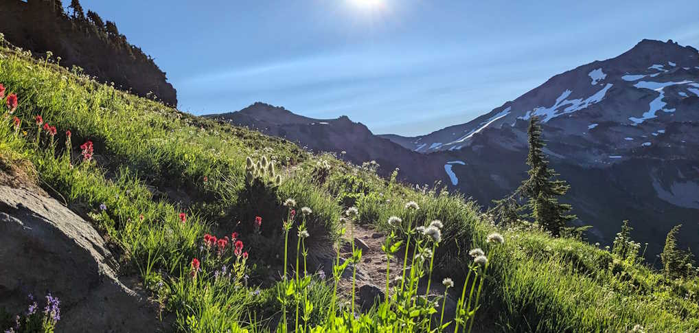 The Goat Rocks Wilderness sits between three volcanoes and in the summer it is a paradise for flower lovers. You won’t have to worry about being alone on this trail, but there is enough space to find a little solitude if desired. The map below shows our route and includes photos of many of the campsites and water sources. This article is still in process so please stop back or subscribe to our newsletter or Facebook page to make sure you don’t miss anything.