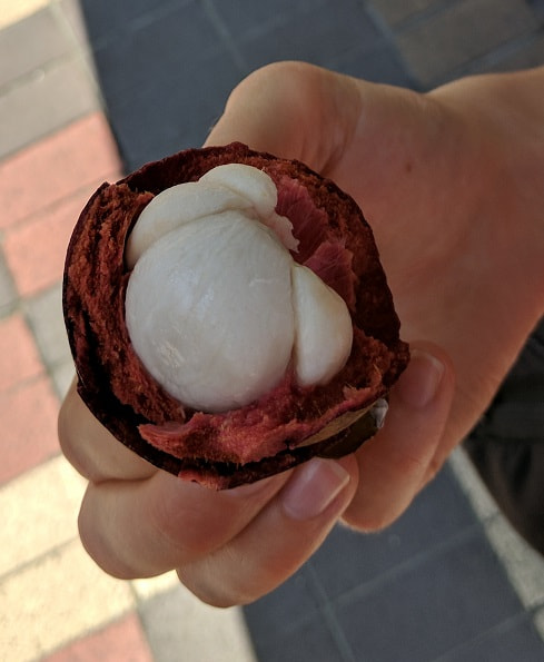 Mangosteen - My new favorite fruit! Tastes something like a mix of a mango and a strawberry, sweet but tart and tangy. The skin permanently stains most anything it comes in contact with (often banned from hotels) and is used in dyes. Inside are several bright white orbs that are about the texture of grapes without skin. The largest has a seed. Most places sold them for about 1-2 ringet (about .25-.50 USD) and would open them for you if you asked and only got one or two. They used to be illegal to import to the US but although the ban has been lifted we have yet to find any.