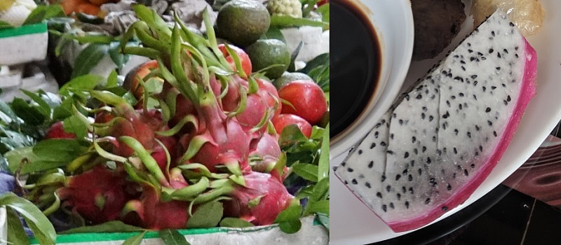 - Dragon Fruit - Thanh Long - While this fruit looks fantastic I found it pretty anticlimactic. The flavor is very mild and bland. They come in a pink version and a bumpy yellow version without the leaves. Do not eat the skin.