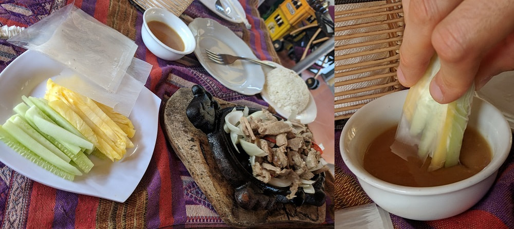 - Goat - Ninh Binh Specialty - We tried this by the water at Tam Cốc River View HomeStay for 135k VND (~$5.80). This dish was a lot of fun to eat, making your own little rolls. The meat was tasty but a little tough. Some of the onions were raw, but others were caramelized. The dipping sauce had a great gingery flavor and the pineapple and cucumber were an unusual, but great pairing.