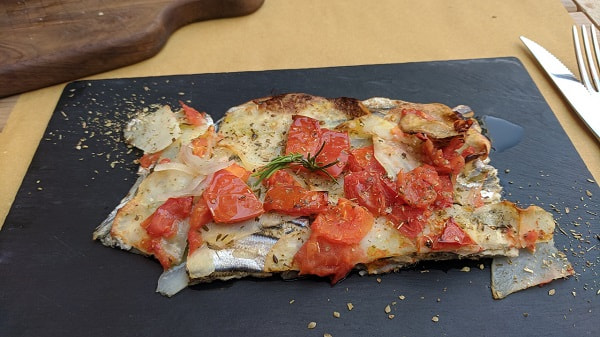 In Riomaggiore, as in many towns, many of the restaurants were closed, contrary to the internet, the guidebooks, and, in many cases, even their signs. Being on the sea and remote, the winters are bitter and many people work only until they have enough money for the winter and then leave. We found a spot and had a tasty lunch at Veciu Muin, a place with a very strange ambience. There was no music, just dead silence, and only a couple other diners, so it was a little uncomfortable. The food was ok but not memorable, except for the gnocchi. The gnocchi was a trio with a meat ragu, a pesto and an olive oil with finely shaved cheese and was excellent. The freshness and depth of all the flavors left us unable to pick a favorite or the three.