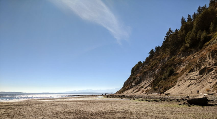Walk barefoot and feel the sand and water on your toes while gazing at a panorama of Mount Rainier, the Northern Cascades, and the Olympic Peaks. Dogs run free here and get to play in the water too.